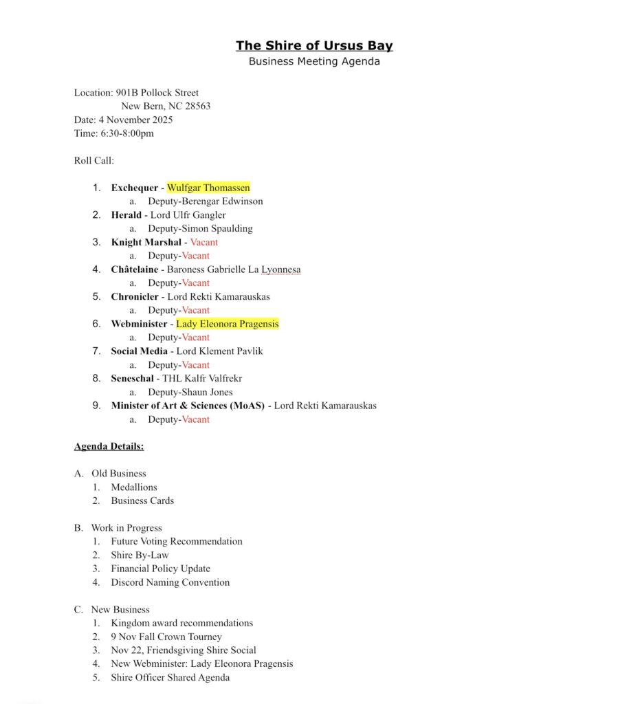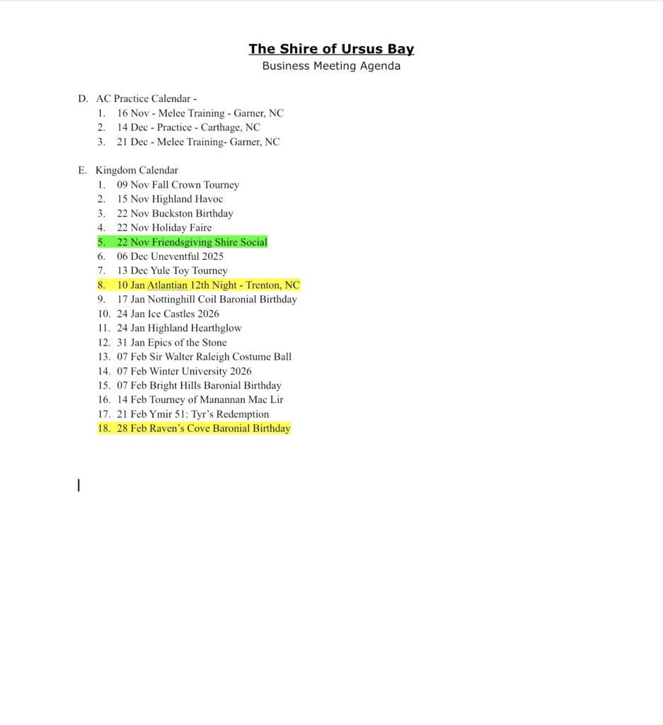 Good Day Ursus Bay, We are approaching the Shire’s bi-monthly business meeting on Tuesday 4 November starting at 6:30pm. Since there was a safety concern due to the location selected at our last meeting in September, the shire officers found a new location for us to use. The business meeting will be located at the Firefly Cafe located at 901B Pollock Street New Bern, NC 28562! This location has a private room, it has a capacity of 30 persons, able to order food and drink if you wish too. Finally, attached (2 pictures) is the agenda for the business meeting. Page one is Roll Call of the current shire officers with agenda details A-C. Page 2 contains a new training calendar and events spiked from the kingdom calendar. We hope you can make the meeting, we would love to have you. We will attempt to stream the meeting, (inshallah connectivity) using either Google Meets and/or Discord. If you have any questions or suggestions, please feel free to email me at seneschal@ursusbay.atlantia.sca.org. Thank you for your time, see you soon!